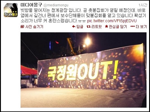 또 다른 트위터리언 ‘@sada*****’는 “청계광장에서 열리고 있는 시국회의 주최 국정원규탄 촛불집회가 청계광장에서 열리고 있습니다. 추석을 지나고 처음 열리는 집회라서인지 몰라도 추석 전 보다는 못해도 열기만큼은 대단합니다”라며 집회 분위기를 실시간 중계했다.