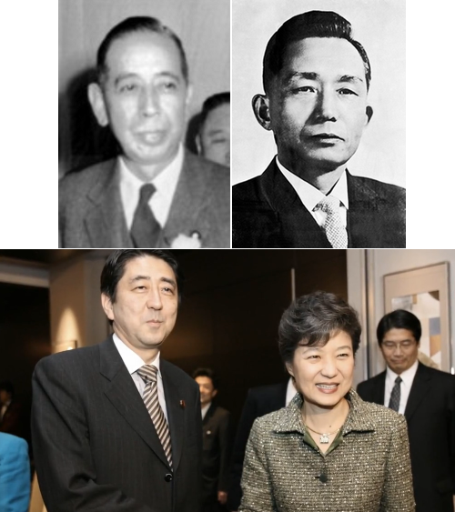 박정희는 1940년부터 1945년까지 만주군관학교와 일본 육군사관학교를 거쳐 만주국의 장교로 복무했으며(‘한목숨 다바쳐 충성함, 박정희(一死以テ御奉公 朴正熙)’ - 박정희가 일본 만주군에 지원하면서 쓴 혈서의 내용), 나중에는 어처구니 없게도 대한민국의 대통령이 되어 굴욕적인 한일협정을 체결한 것이다. 그리고 2012년 12월 19일, 박정희의 딸 박근혜는 제18대 대통령이 된다. 기시 노부스케와 박정희, 아베 신조와 박근혜.. 만약 일본 국민들이 아베를 선택하지 않았다면, 또 한국 사람들이 박근혜를 뽑지 않았다면 어떻게 됐을까?
