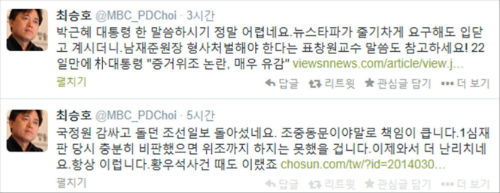 10일 최 PD는 이날 자신의 트위터에 <조선일보>가 10일 “증거 위조 지시했든, 묵인했든, 몰랐든… 국정원 ‘사면초가’”, “국정원, 간첩 입증에 공신력 높이려 李 영사 압박했나”, “국정원 독촉에… 가짜 확인서(간첩 혐의자의 출입경 확인) 만들어 보냈다”등을 비롯해 1~3면과 사설 등을 ‘공무원 간첩사건’으로 집중 보도한 것에 대해 이같이 말했다.