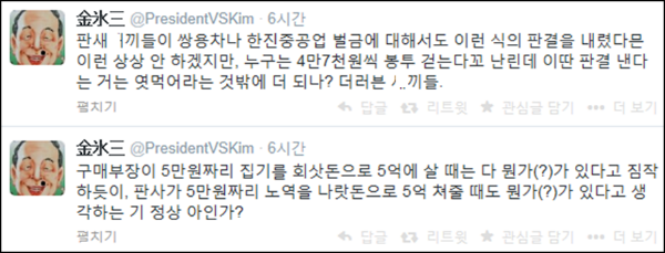 재판부의 이상한 ‘5억원 노역’ 판결에 파워트위터리안을 비롯해 네티즌들은 “대한민국에 정의가 있는지 의문이다”, “과연 헌법이 국민에게 평등한가”라며 비난 반응들을 보였다.