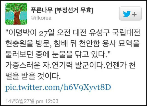 27일 오전 이명박 전 대통령이 대전 현충원을 방문해 참배한 뒤 천안함 용사 묘역을 둘러보던 중 눈물을 닦고 있는 사진이 온라인 상에서 화제가 되었다.