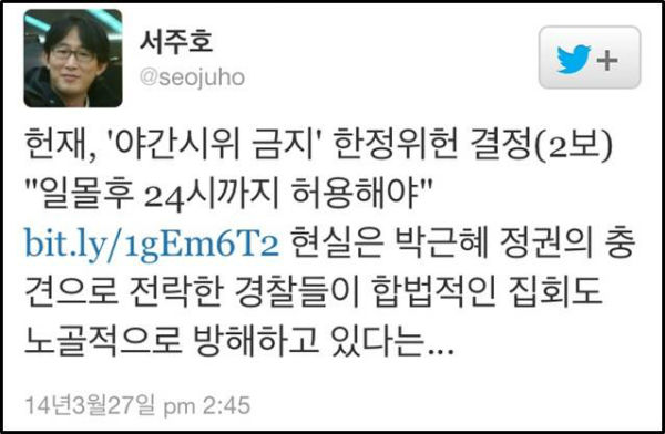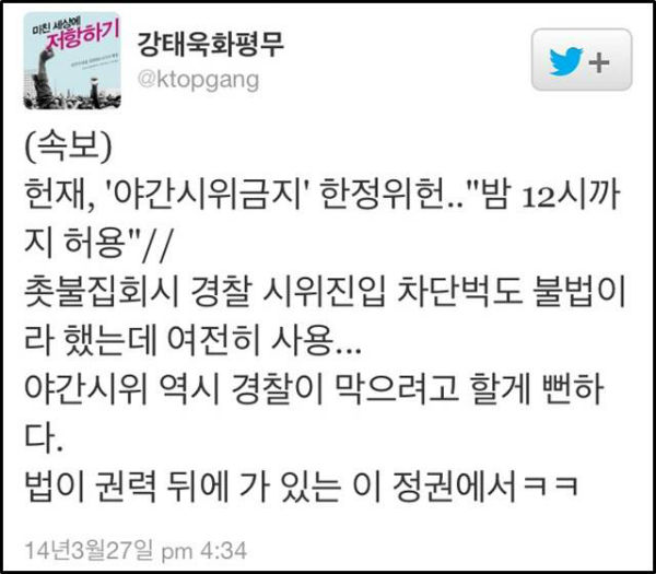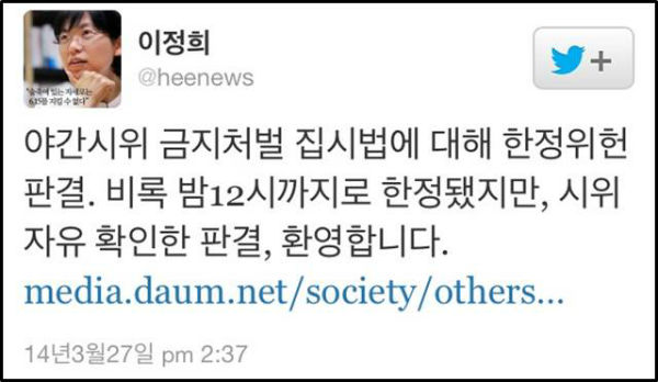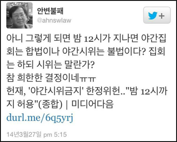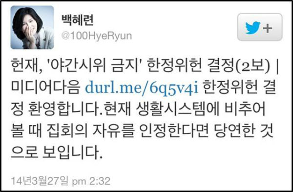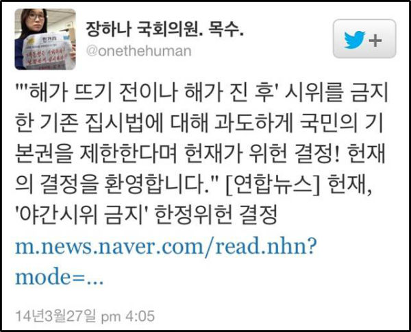헌법재판소가 27일 해가 진 후부터 같은 날 24시까지의 시위는 허용해야 한다고 결정한 가운데 SNS 에서는 “당연한 결정”, “이런 결정이 비정상의 정상화”, “시위 자유 확인됐다” 등의 반응들을 보이며 헌재의 판결을 환영했다.