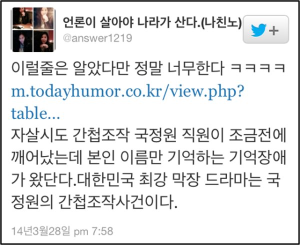 28일 ‘서울시 공무원 간첩 증거조작 사건’과 관련해 검찰 조사를 받은 뒤 자살을 기도했던 국가정보원 권모과장이 의식을 되찾았다. 그러나 단기 기억 상실 등 일부 기억 장애를 보일 수 있다는 진단이 나오면서 SNS 등 네티즌들은 ‘막장드라마’라며 비난 반응을 보였다.