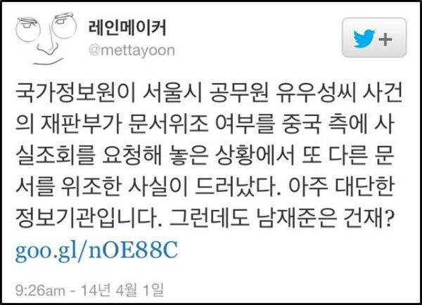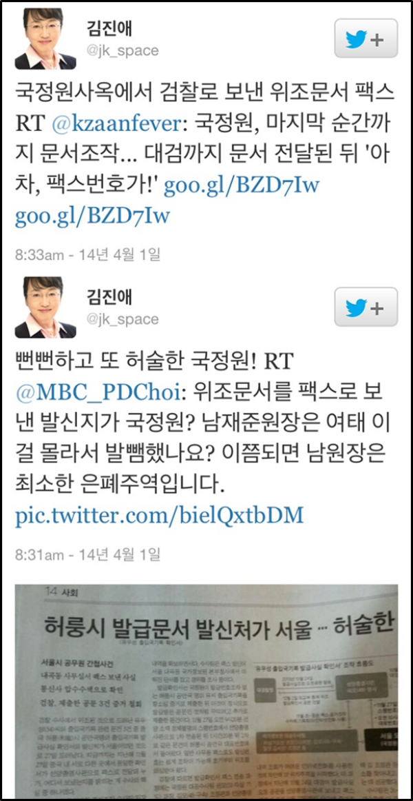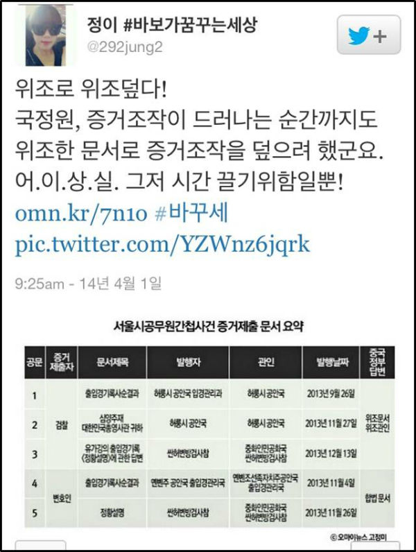 지난달 31일 서울중앙지검 증거조작 수사팀이 김 과장과 국정원 협조자 김모씨를 문서위조 혐의로 구속기소한 가운데, 이번 ‘서울시 공무원 간첩사건’의 증거조작이 국정원 직원들과 협조자의 조직적이고 계획적인 범행으로 밝혀지며 비난 여론이 눈덩이처럼 불어나고 있다.