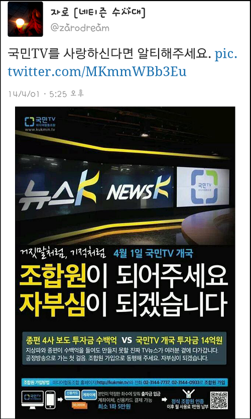 미디어협동조합 국민TV가 오늘(1일) 개국했다. 트위터 등 SNS에서는 국민TV의 개국을 오랫동안 기다려온 네티즌들이 기대감을 표하는 동시, 축하와 응원의 메시지를 보내고 있다.