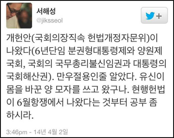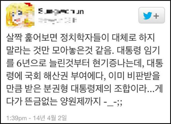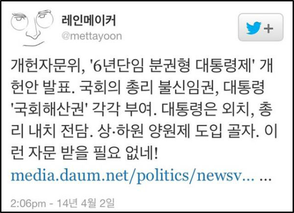 2일 국회의장 직속 헌법개정자문위원회가 6년 단임제 대통령과 국회 양원제를 골자로 한 헌법 개정 자문안을 중간 발표해 SNS 등에서 논란이 일고 있다.