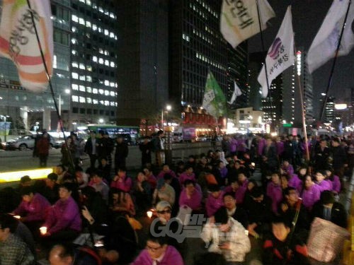 민주노총, 한국진보연대 등 44개 시민단체로 구성된 ‘공안탄압규탄대책위’가 2일 오후 7시 20분 서울 청계광장에서 남재준 국정원장의 파면을 촉구하는 ‘민주찾기 촛불행진’에 앞서 사전 집회를 하고 있다.