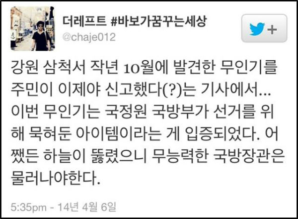 이에 SNS 등에서는 6개월동안 방공망이 뚫린 사실조차 눈치 채지 못한 군에 비난 목소리를 높였다. 일각에서는 지방선거를 앞둔 ‘북풍’이라는 조롱과 함께 김관진 국방부장관의 사퇴를 주장하기도 했다.