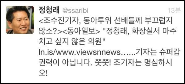 정 의원은 6일 다음 아고라에 ‘<정청래 입니다> 동아일보 조수진 기자에게’라는 글을 올려 “동아일보 조수진 기자, 내가 화장실에서도 마주치고 싶지 않은 기자입니다. 제가 왜 이 말을 하는지는 조 기자가 잘 알겁니다. 가는 말이 고와야 오는 말이 곱다는 것을 이번 기회에 조 기자는 잘 아시기 바랍니다”라고 질타했다.