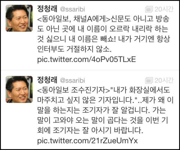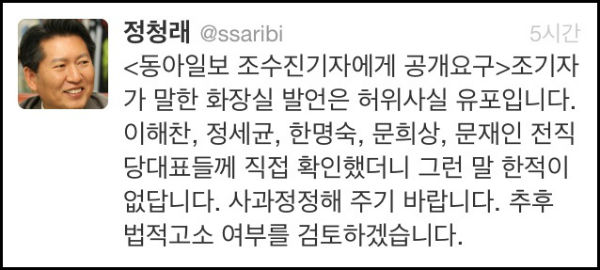 정 의원은 이어 7일 트위터에는 “조 기자가 말한 화장실 발언은 허위사실 유포입니다. 이해찬, 정세균, 한명숙, 문희상, 문재인 전직 당대표들께 직접 확인했더니 그런 말 한 적이 없답니다”라며 “사과정정해 주기 바랍니다. 추후 법적고소 여부를 검토하겠습니다”라고 경고했다.