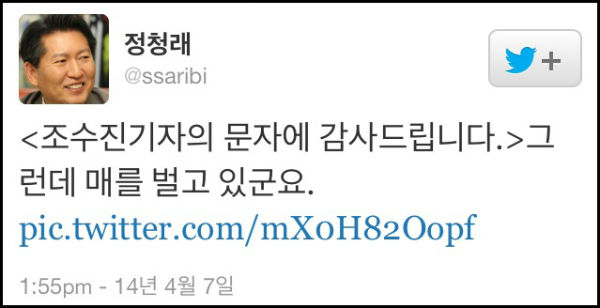 이에 정 의원은 트위터를 통해 받은 문자 메시지를 공개하고 “조수진 기자의 문자에 감사드립니다”라며 “그런데 매를 벌고 있군요”라며 힐난했다.