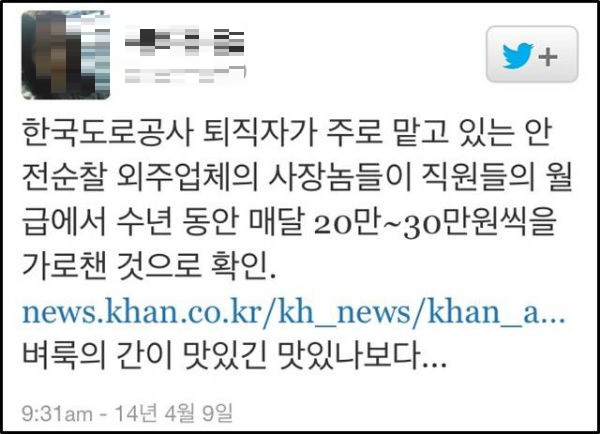 한국도로공사에서 외주를 맡아 고속도로 점검과 교통사고 처리를 하는 안전순찰업체 사장이 직원 인건비로부터 매달 1인당 20여만원을 수년간 가로챈 것으로 드러나 네티즌들의 비난이 거세게 일고 있다.