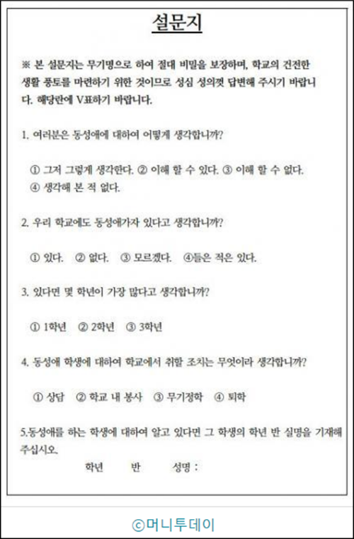 게다가 동성애하는 친구나 선후배가 있을 경우 그들의 실명까지 모두 기재하라는 종용 내지 압박마저 서슴지 않고 있다. 아무래도 우리 사회에서의 인권이란 교과서 속 활자 형태로만 존재하는가 보다. 이 설문이 진정 일선 학교에서 학생들을 대상으로 만들어진 게 맞는 걸까? 마치 경찰서에서 피의자 신문 조서 꾸미는 것과 진배없지 않은가.
