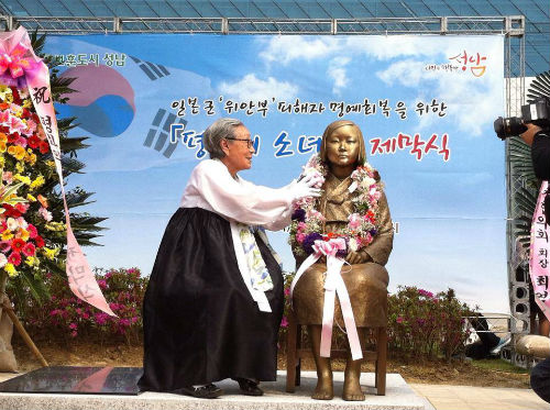 일본군 위안부 피해자를 기리는 평화의 소녀상 제막식이 15일 오전 성남시청 광장에서 열렸다. 한국정신대문제대책협의회(정대협)와 위안부 피해자 김복동 할머니, 국가보훈 안보단체, 시민 등 200여 명이 참석했다.