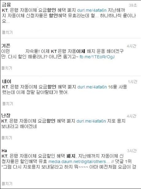 KT의 이번 폐지 결정에 대해 17일 트위터에는 “지난해 신청자들은 할인혜택 유효라는데...하나하나씩 줄이나요”(금융***), “KT 은행 자동이체 해지 운동해야겠구만”(기픈***), “이제 정말 갈아탈 때가 됐어”(네이***), “지로 용지 보내달라고 해야겠네”(난장***) 등 불만을 터뜨리는 글들이 이어졌다.