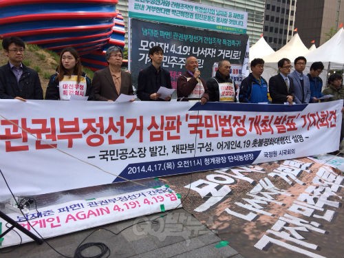 국정원 시국회의 소속 관계자들이 17일 오전 서울 청계광장에서 ‘관권부정선거 심판 국민법정 개최 발표’기자회견을 열었다.