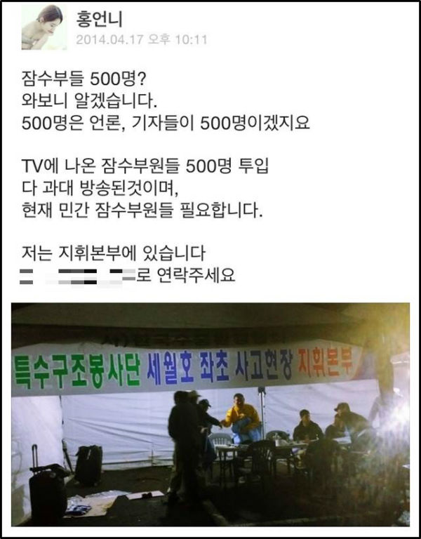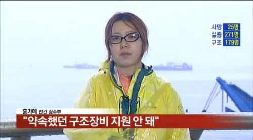 현장에서 구조 작업을 돕고 있는 민간 잠수부 홍가혜 씨는 18일 오전 <MBN>과의 인터뷰에서 “민간 잠수부들과 현장 관계자의 협조가 전혀 이루어지지 않는 상황이며 장비 지원이 거의 되지 않아 수색 진행이 힘들다”고 털어놓았다.