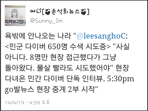 이날 방송에서는 “구조 당국이 밤새 아무것도 하지 않았다. 청와대로 가겠다”는 항구 앞 실종자 가족들의 울분의 기자회견이 소개됐다. 또 사고 현장에 다녀온 민간 다이버들을 단독 인터뷰했다. 다이버들은 “민관군 다이버 600여명 수색 시도”는 “사실이 아니다”며 “8명만 현장에 접근했다가 그냥 돌아왔다. 물살이 빨라도 시도했어야 한다”고 주장했다.