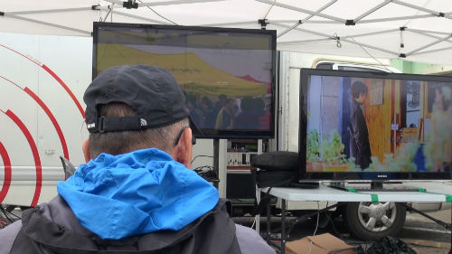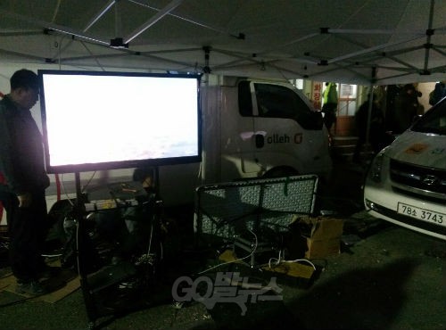 ▲ 4월 19일 오전 10시 수색작업을 진행중인 CCTV 화면(좌) KBS 수상기 (오) ⓒ'go발뉴스'