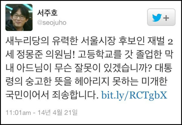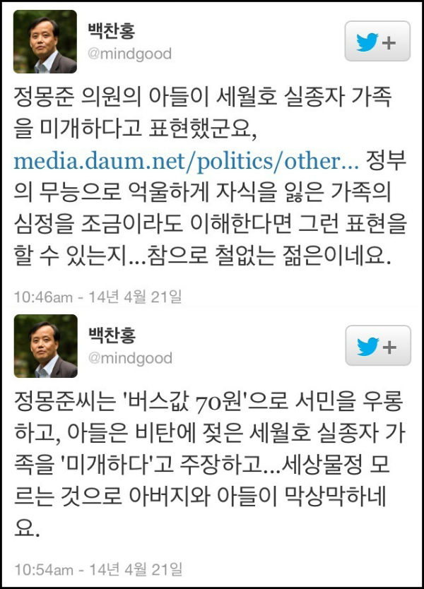 새누리당 서울시장 예비후보인 정몽준 의원의 막내아들이 세월호 실종자 가족과 국민을 “미개하다”고 비하한 발언이 알려지자 정 의원이 서둘러 사과했다. 정 의원의 사과에도 불구하고, SNS에서는 신중치 못한 발언에 대한 비난이 쇄도하고 있다.