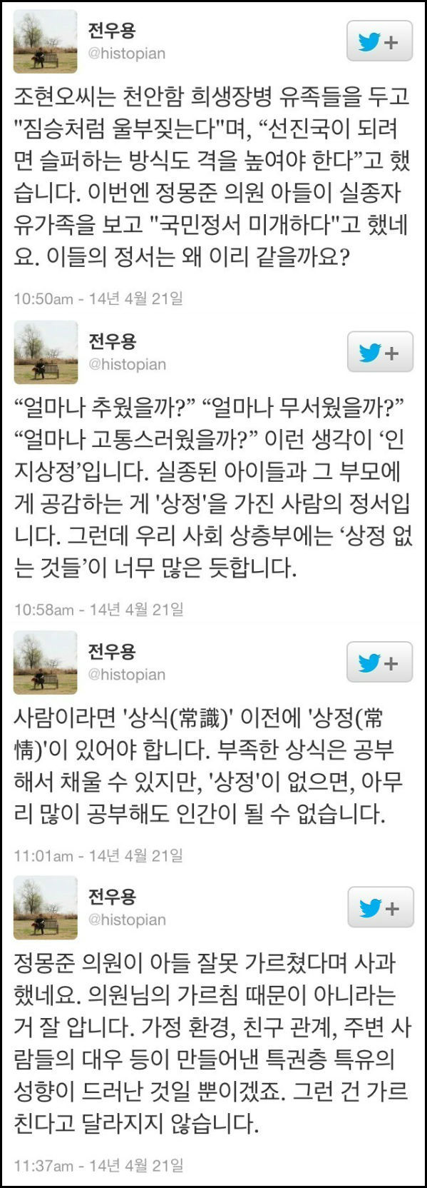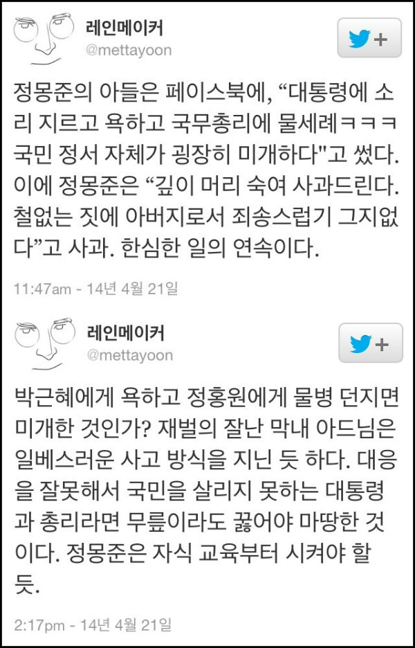 네티즌들은 “미개한 국민한테 군림하려고 아버지가 서울시장 출마하려고 하신거야?”( @nic****), “정몽준은 서울시장 후보는 물론 국회의원직도 사퇴해야 합니다. 세월호 아이들 대부분 97년생. 정몽준 아들 96년생 또래들이 저런 고통을 당했는데도 슬픔을 나누기는커녕 가족들에게 씻을 수 없는 상처를 줬다”(@son****), “96년생 아이가 한말치곤 너무 세다! 이게 작금 소위 한국 상위 1% , 상류계층의 우월주의에 빠진 정신상태”(@ste****), “부전자전이라는 말이 딱 맞는 말이다. 정몽준 평소 자식 교육을 어떻게 했으면 저딴 소리가 나오나? 미개한 국민한테 세금 받는 아버지 있어 좋겠네”(@met****)라며 비판했다.