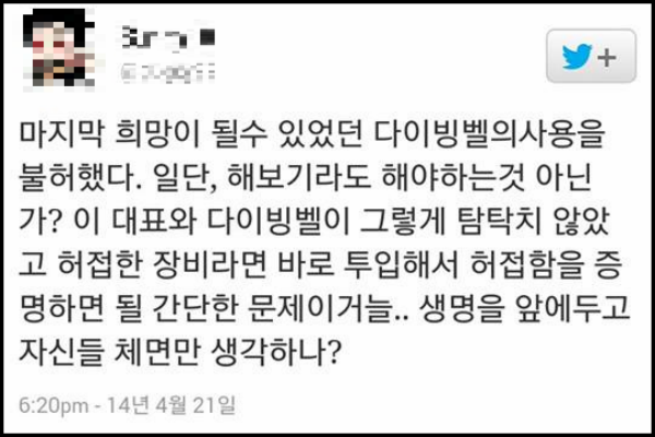 21일 세월호 사고현장에 투입돼 실종자 수색작업을 도울 것으로 기대를 모았던 ‘다이빙벨’의 투입을 구조당국이 결국 불허해 네티즌들의 공분을 사고 있다.