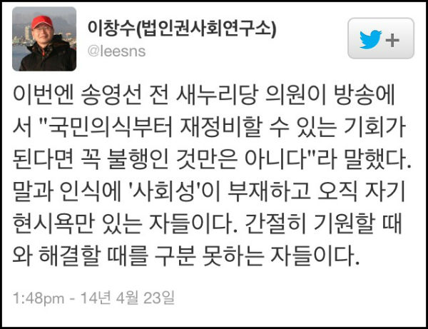 또 “세월호 사고를 잘됐다고 평가한 송영선이 누군가 봤더니 박근혜를 대통령으로 만들려면 1억5000만원이 필요하다며 지역구 사업가 돈 뜯어내려다 녹취록 공개돼서 개망신 당한 주인공이네”(@bog*****), “송영선의 발언 중 제일 기가 막히는 것은 세월호 사건으로 국민의 의식부터 바꿔야 한다는 대목이다. 사고는 지들이 다 치고 바꿔야하는 건 국민? 박근혜를 찍은 국민을 말하는 거냐?”(@wri****)라며 힐난했다.