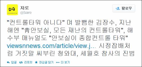 이는 23일 세월호 침몰사고와 관련, 청와대가 제 역할을 못하고 있는 것 아니냐는 지적에 대해 청와대 민경운 대변인을 통해 “안보실은 자연재해 같은 것이 났을 때 컨트롤 타워가 아니다”고 했던 것과 대비된다.