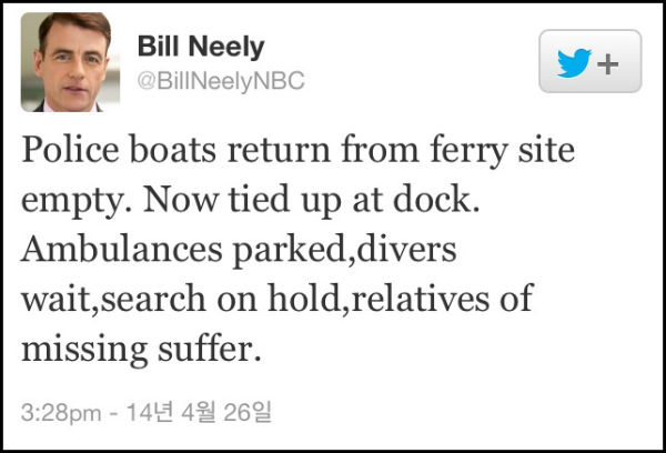 특히 빌 닐리 기자는 자신의 트위터에도(@BillNeelyNBC) “경찰선들이 여객선 현장으로부터 빈 배로 돌아온다. 지금은 부두에 매여있다. 구급차들은 주차돼 있고, 잠수부들은 대기중이며 수색은 중단되고 실종된 사람들의 친지들은 고통 받고 있다”며 현장 분위기를 전달하기도 했다.