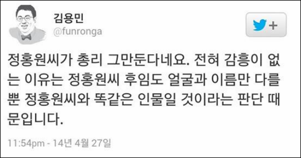 김용민 평론가(@funronga)도 “정홍원씨가 총리 그만둔다네요”라며 “전혀 감흥이 없는 이유는 정홍원씨 후임도 얼굴과 이름만 다를뿐 정홍원씨와 똑같은 인물일 것이라는 판단 때문입니다”라고 비난했다.