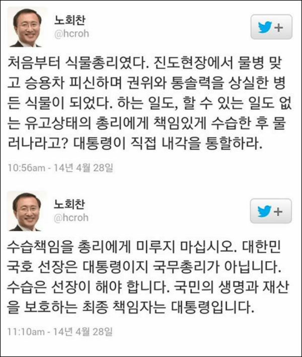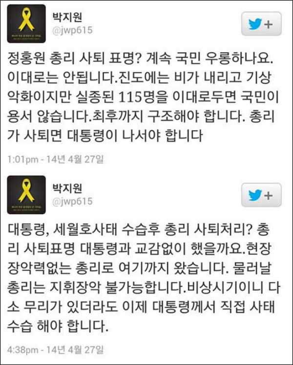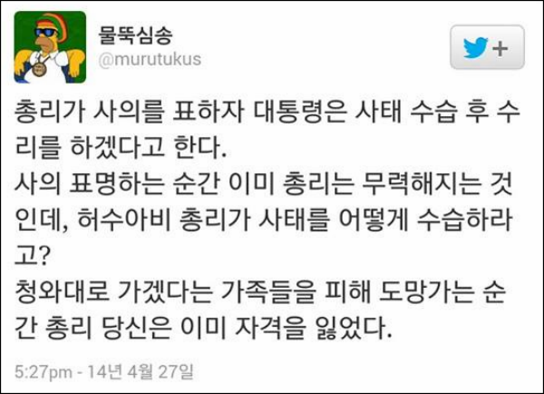 진중권 동양대 교수(@unheim)도 정홍원 총리 사퇴 소식에 “인명구조보다는 각하구조, 사태수습보다는 민심수습. 그들에게 우선권이 어디에 있는지 잘 보여주는 사태”라며 “아울러 기억해야 할 것은 총리가 사퇴한 이유가 ‘국정에 부담을 주지 않기 위해서’였다는 점”이라고 지적했다.