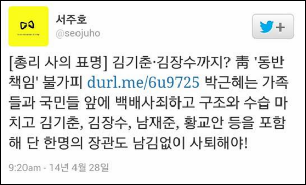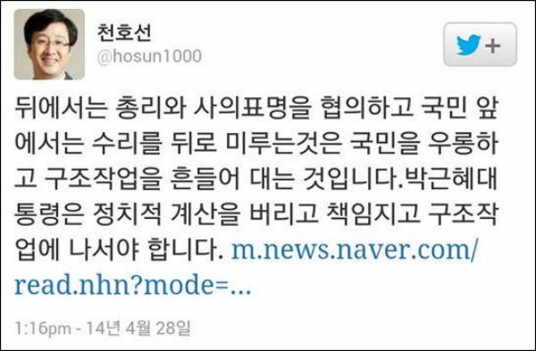야당의원들의 비난도 빗발쳤다. 새정치민주연합 박지원 의원(@jwp615), 정의당 천호선 대표(@hosun1000) , 노회찬 전 의원(@hcroh)도 각각 트위터를 통해 “대통령께서 직접 사태 수습에 나서야 한다”고 촉구했다.