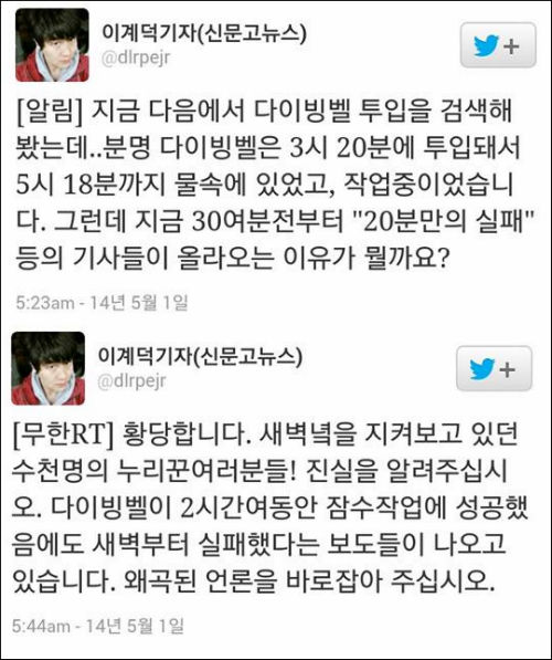 1일 다이빙벨이 2시간 여 잠수하며 성공적으로 운영된 가운데, <연합뉴스>가 오전 5시 21분경 “다이빙벨 투하했지만 물밖으로”라는 기사를 내보내는 ‘오보 해프닝’을 벌였다.