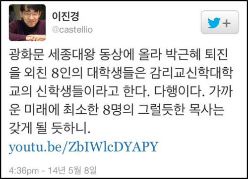 감리교신학대 학생 8명은 이날 오후 2시 30분께 사다리를 이용, 광화문광장 세종대왕 동상에 올라 “아이들을 살려내라”, “특검을 실시하라”, “유가족 요구안 전면 수용하라” 등의 구호를 외치며 박근혜 정권의 퇴진을 요구했다.