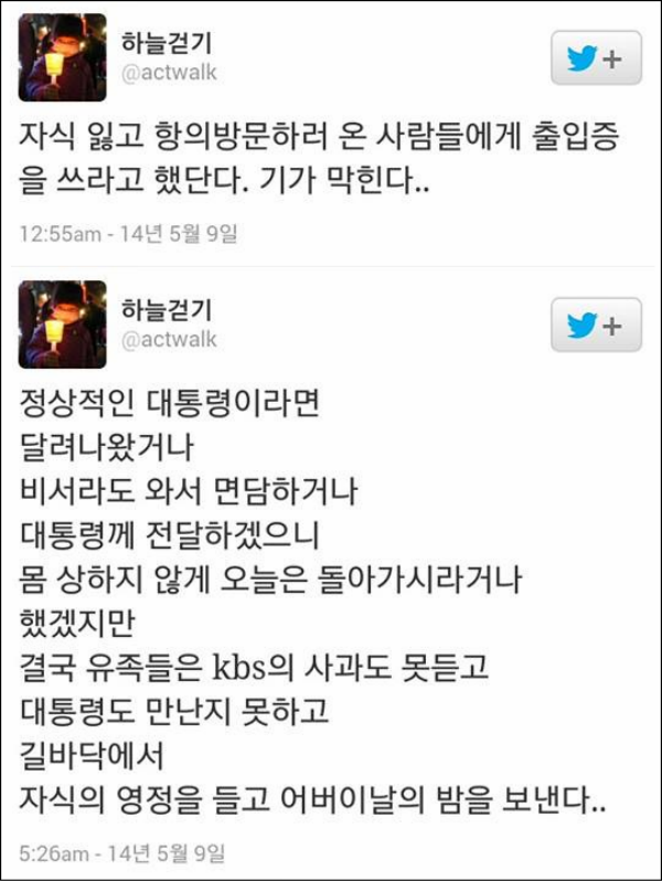 이 후 유족들은 ‘이제 호소할 사람이 대통령 밖에 없다. 박근혜 대통령을 만나겠다’며 9일 새벽 4시께 청와대 인근에 위치한 청운효자동주민센터에 도착했다. 그러나 경찰의 제지로 이들은 밤새 대치했다.