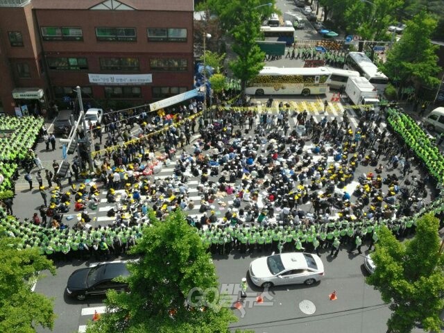 9일 경찰이 박근혜 대통령과의 면담을 요구하며 청운효자동주민센터에 모인 세월호 희생자 유가족들을 똘똘 에워싸며 고립시키고 있다. 이날 새벽 13개 중대 900여명의 병력을 배치한 경찰은 추가 인원을 투입하며 유가족들을 저지하고 있다.