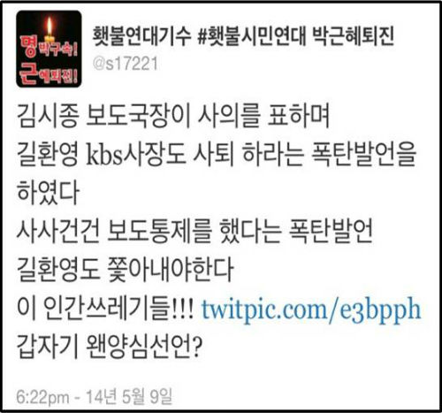 9일 김시곤 KBS 보도국장이 사임 기자회견에서 “언론에 대한 어떠한 가치관과 신념도 없이 권력의 눈치만 보며 사사건건 보도본부의 독립성을 침해해 온 길환영 사장은 즉각 자진 사퇴해야 한다”고 폭탄 발언을 던진데 이어 추가 증언을 쏟아내며 파문이 일고 있다.