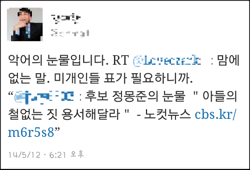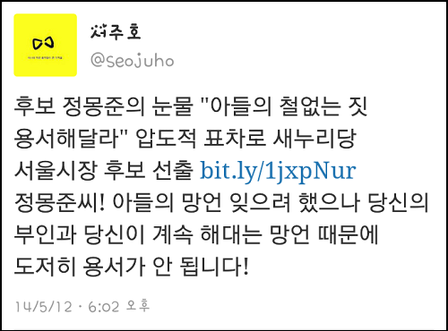 이날 정 의원은 수락연설에서 “제 아들의 철없는 짓에 진심으로 사과 드린다”며 “제 막내 아들 녀석도 너그럽게 용서해주시길 바란다”고 말하며 눈물을 보였다.
