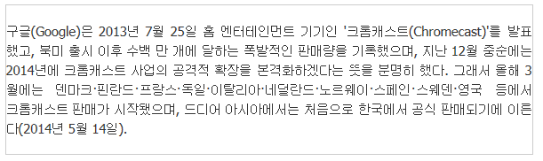 [관련 보도에 따르면, 한국에서 크롬캐스트는 CJ헬로비전의 '티빙'과 SK플래닛의 '호핀' 서비스도 제공할 예정이라고 한다]