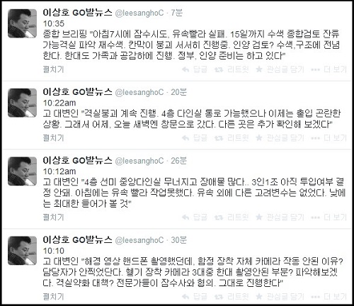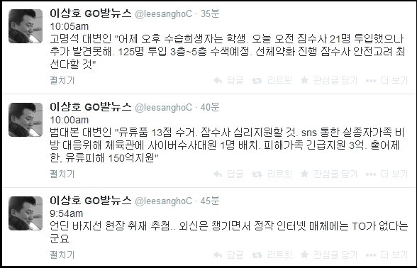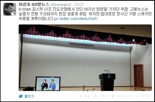 14일 오전 이상호 기자는 트위터를 통해 “9:54am 언딘 바지선 현장 취재 추첨.. 외신은 챙기면서 정작 인터넷 매체에는 TO가 없다는군요”라며 진도군청에서 진행되는 범정부사고대책본부의 브리핑에 대해 이같이 알렸다.