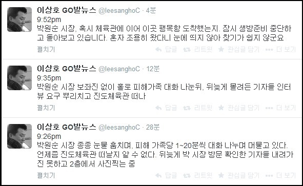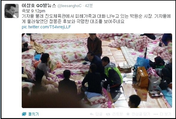 그런가하면 같은 날 박원순 현 서울시장도 진도실내체육관을 찾아 가족들을 위로했다. 박 시장은 수행원 없이 홀로 피해가족과 대화를 나눈 뒤, 뒤늦게 몰려든 기자들의 인터뷰 요구를 뿌리치고 진도체육관을 빠져나간 것으로 전해졌다.