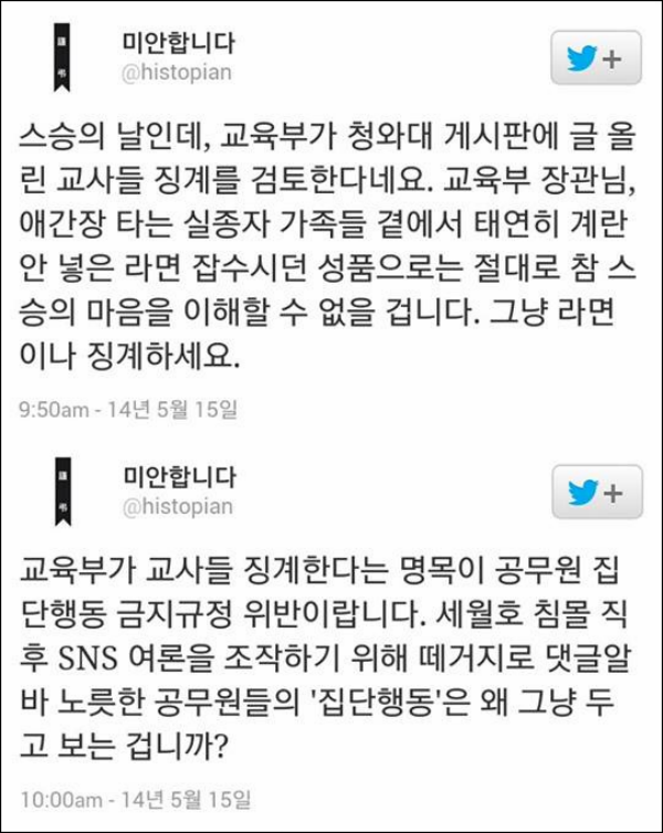 14일 교육부는 전국 시·도 교육청에 공문을 보내 청와대 게시판에 글을 올린 교원들의 신상 등을 파악해 제출하라고 요구하고, 교사들의 행위가 공무와 집단행위를 금지한 국가공무원법을 저촉한 것으로 판단, 징계를 한다는 내부방침을 정한 것으로 알려졌다.
