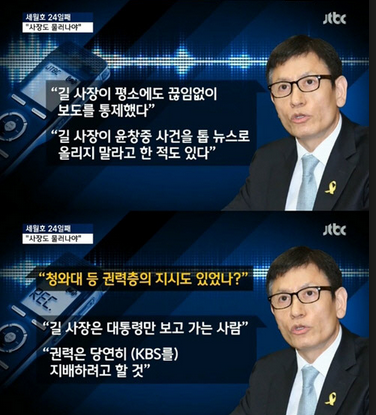 그 자리에서 길 사장은 보도국장에게 “청와대로부터 연락이 왔으니 회사를 그만두라”고 말하며 눈물을 흘렸단다. “대통령의 뜻(보도국장 사퇴)이니 따라야 한다”며 눈물로 사퇴를 종용한 것이다.