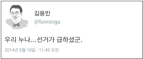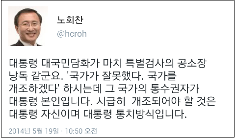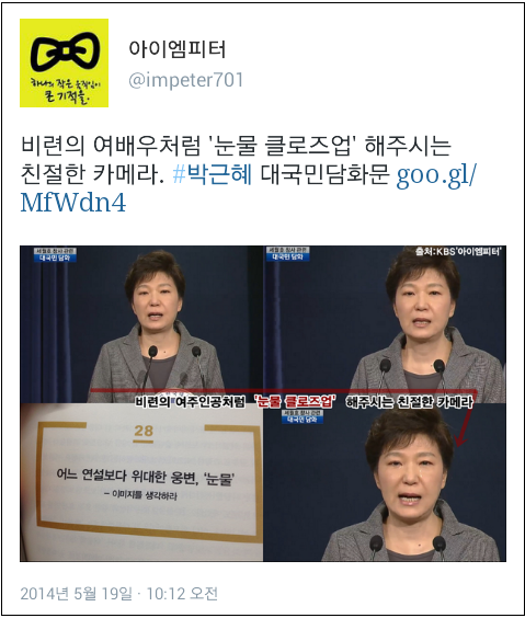 SNS상 파워트위터리안들의 반응도 야권과 비슷했다. 정치시사블로거인 아이엠피터(@impeter701)는 “비련의 여배우처럼, ‘눈물 클로즈업’해주시는 친절한 카메라”라는 짤막한 멘트로 일침을 놨다.
