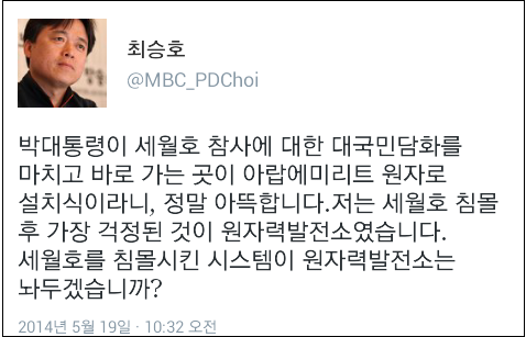 뉴스타파 최승호 PD(@MBC_PDChoi)는 “박대통령이 세월호 참사에 대해 대국민담화를 마치고 바로 가는 곳이 아랍에미리트 원자로 설치식이라니 정말 아뜩합니다”라며 “저는 세월호 침몰 후 가장 걱정되는 것이 원자력발전소였습니다. 세월호를 침몰시킨 시스템이 원자력발전소는 놔두겠습니까”라고 비난했다.