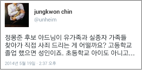 해당 소식이 전해지자 네티즌들은 “정몽준 아들 정신이나 차릴런지..(@kangju****)” “정몽준 아들의 생각이 우리나라 정부관료들의 사고방식이다(@apti****)”라는 등의 반응을 보였다.