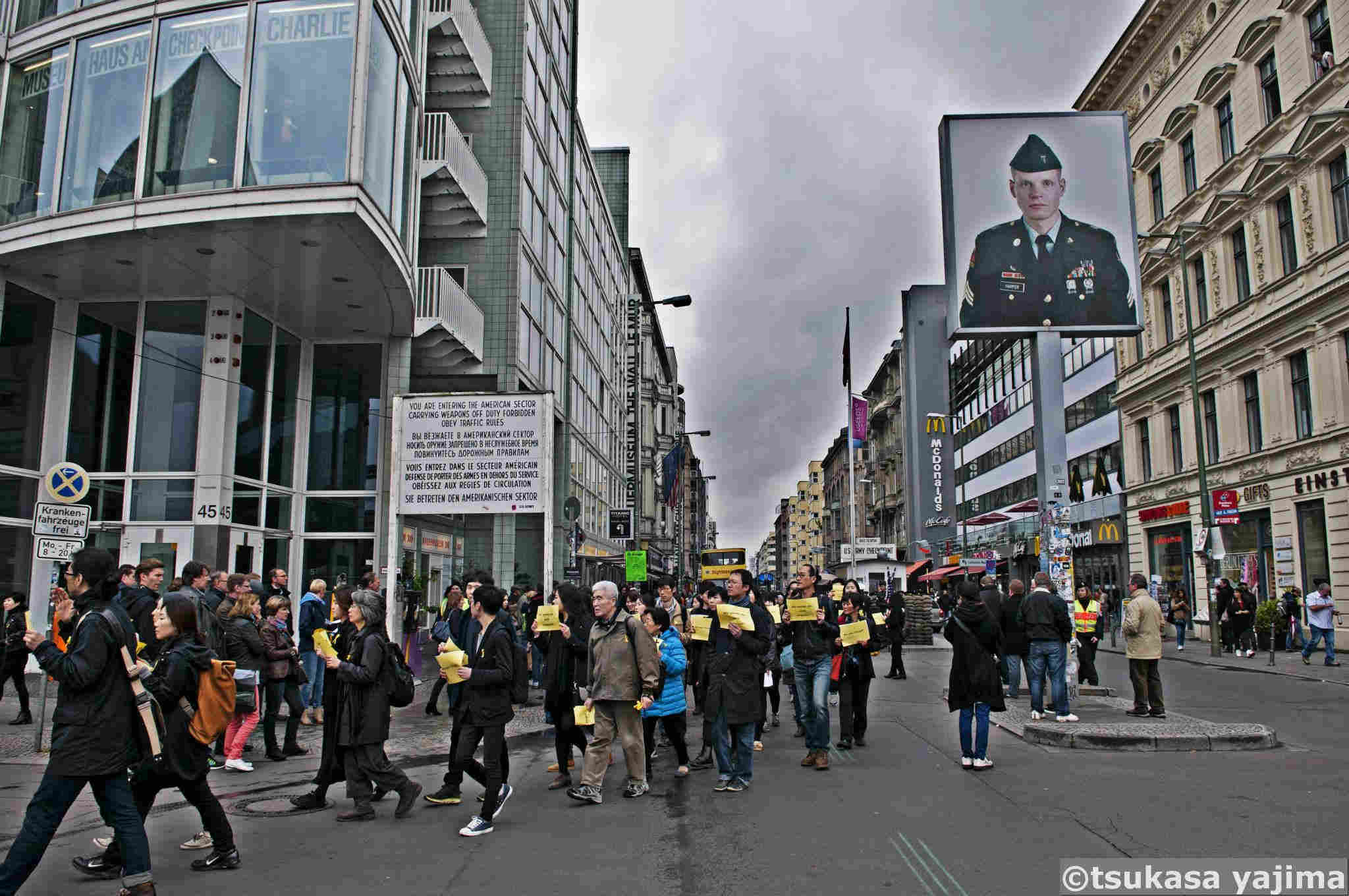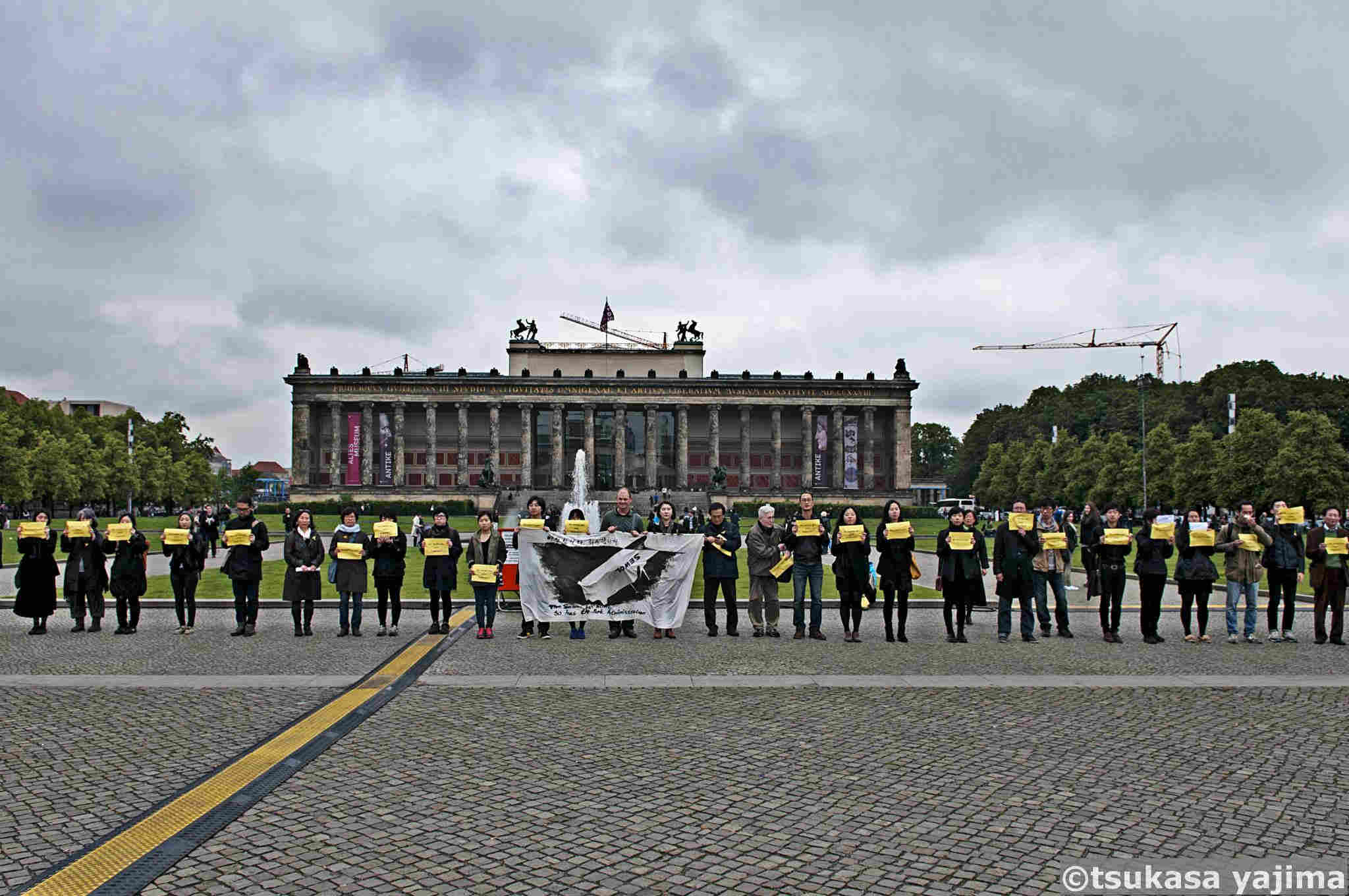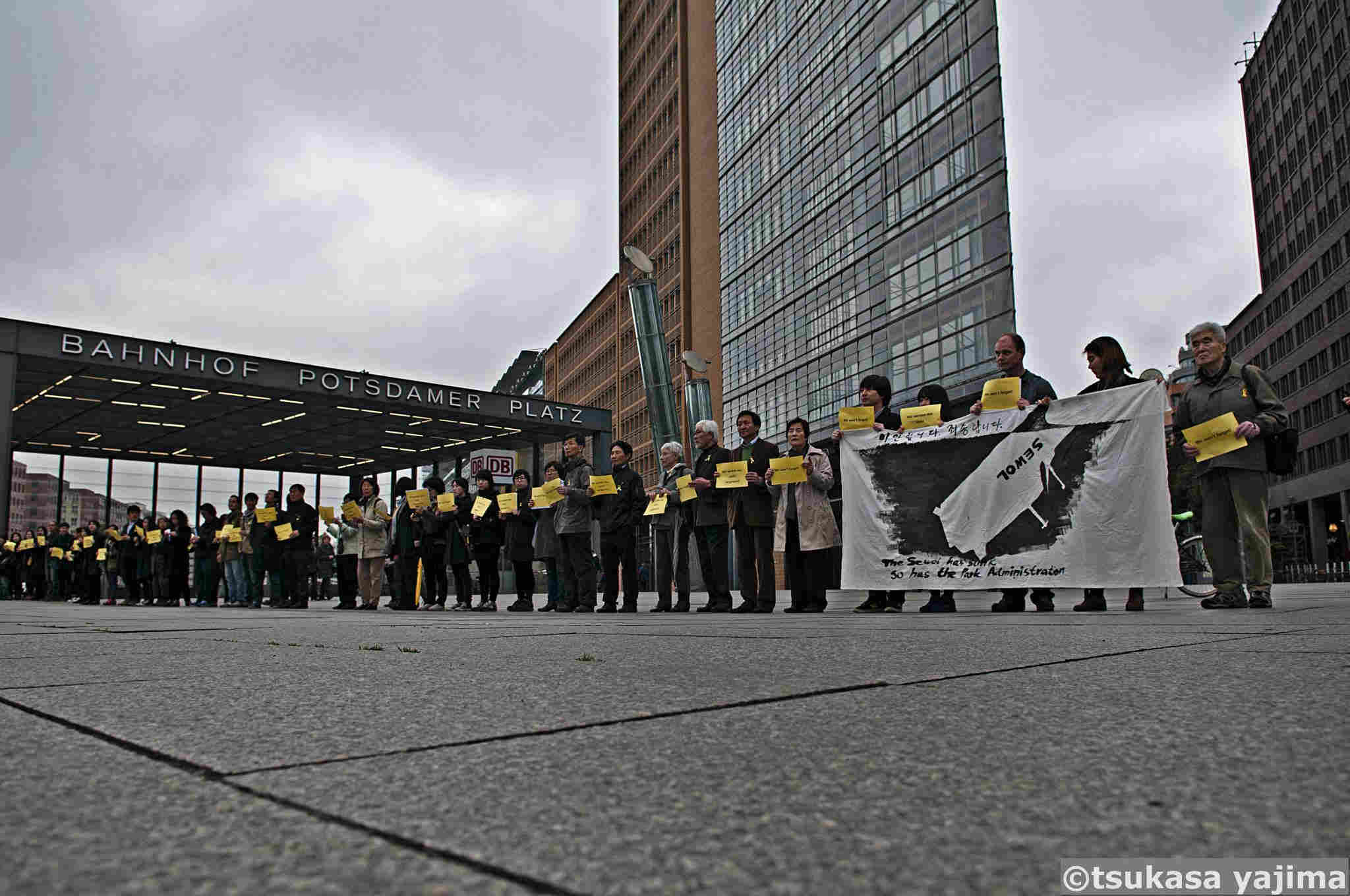 수 백장의 영독으로 되어 있는 전단지가 뿌려지고, 침묵행진이 포츠담 광장(Potsdamer Platz)에서 시작해, 한국 문화원, 마틴-그로피우스-바우 미술관(Groupius-Bauhaus Museum), 야외 전시장 “토포그라피 오브 테러”있는 옛날 베를린 장벽과 체크포인트 찰리 (Checkpoint Charly) 를 거쳐 루스트 정원에(Lustgarten) 에 있는 베를린 돔 (Berliner Dom)에 도착했다.