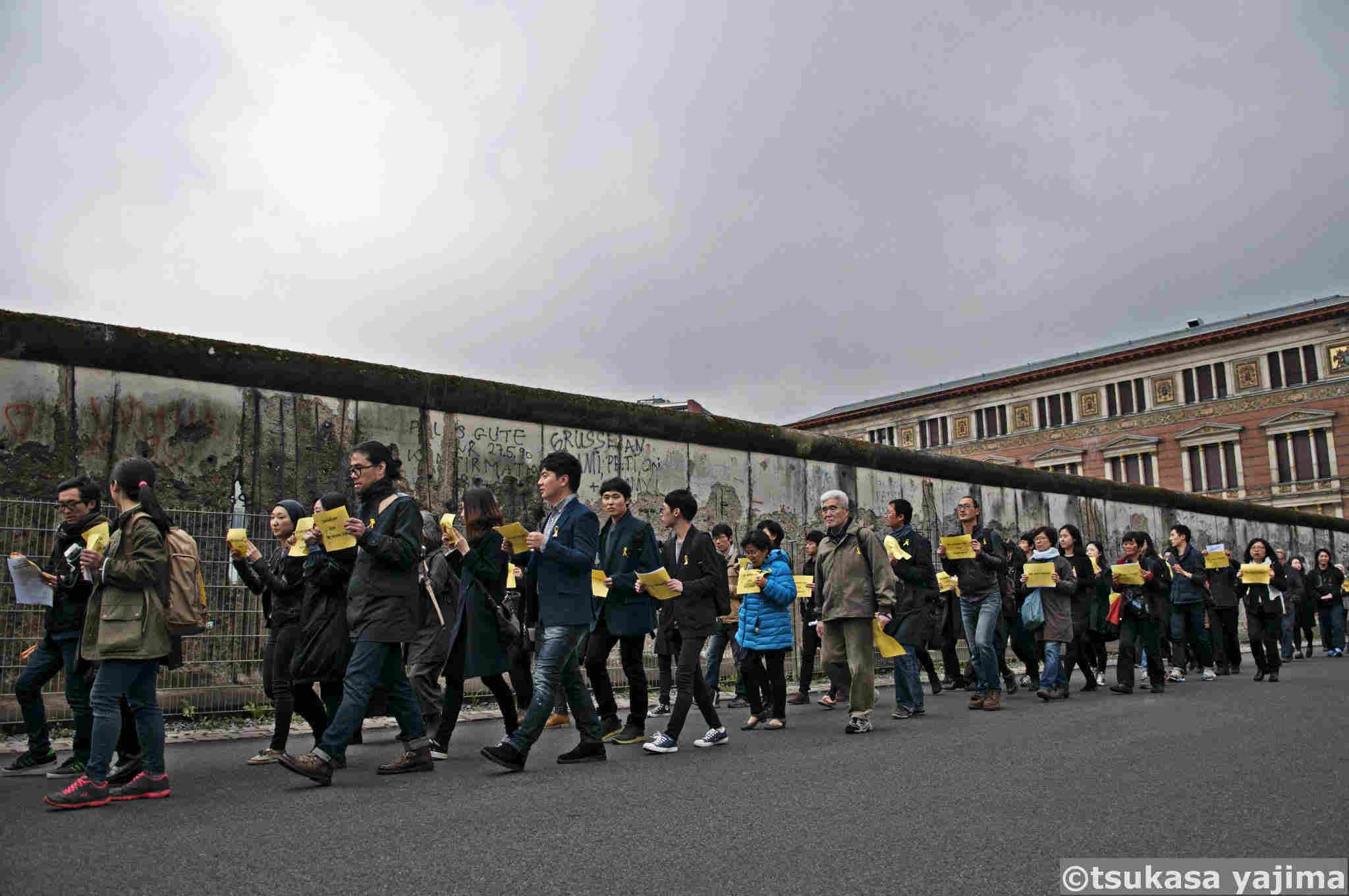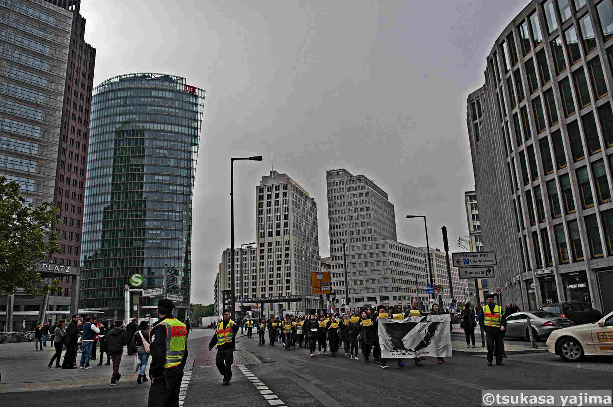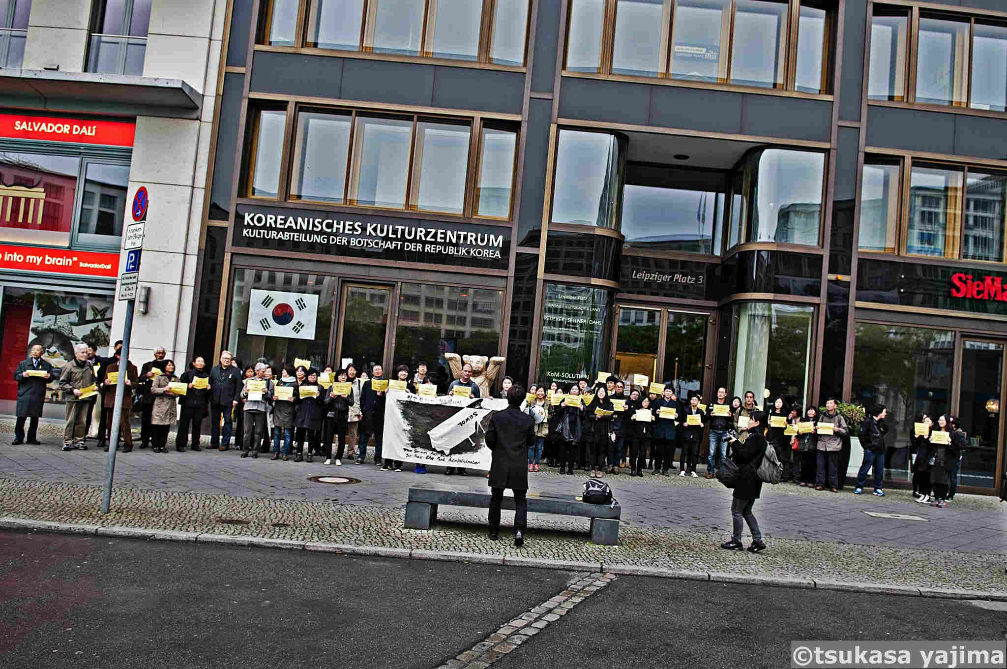 수 백장의 영독으로 되어 있는 전단지가 뿌려지고, 침묵행진이 포츠담 광장(Potsdamer Platz)에서 시작해, 한국 문화원, 마틴-그로피우스-바우 미술관(Groupius-Bauhaus Museum), 야외 전시장 “토포그라피 오브 테러”있는 옛날 베를린 장벽과 체크포인트 찰리 (Checkpoint Charly) 를 거쳐 루스트 정원에(Lustgarten) 에 있는 베를린 돔 (Berliner Dom)에 도착했다.