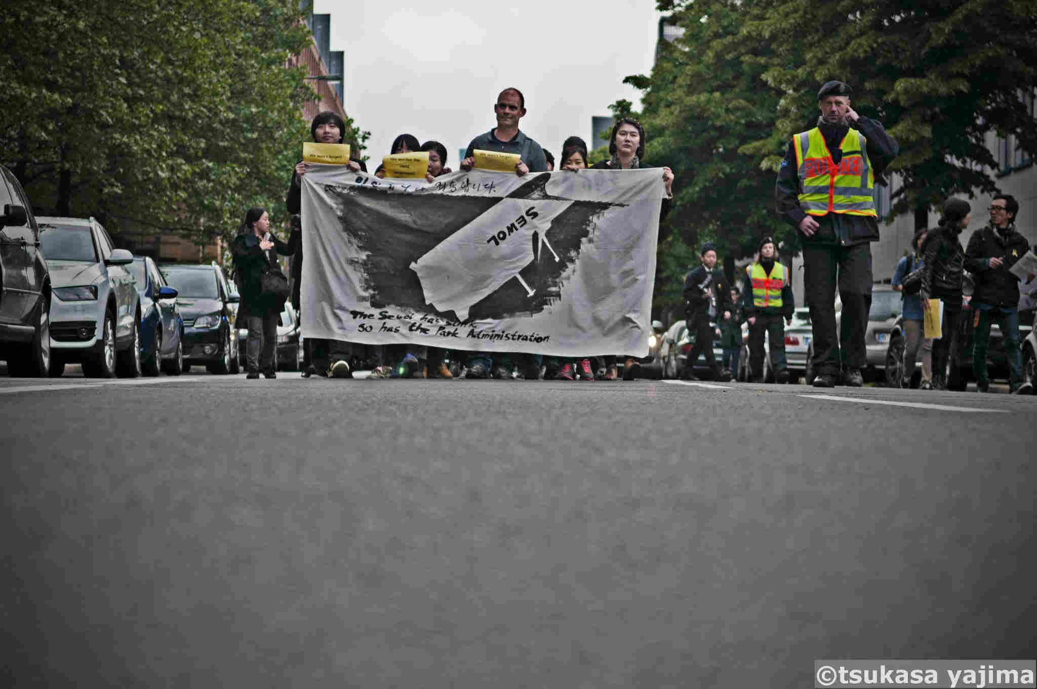 베를린 돔에 서서 시위자들이 “임의 행진곡” 부르며, 진상규명을, 정부의 책임을 묻는 성명서를 읽는 중 한국 교민 한분이 침묵행진이 아무런 탈 없이 진행 될 수 있게 함께하는 경찰 담당자와 서서 대화하며 한국경찰들이 한국에서는 시위에 어떻게 반응하는가를 들려줬다. 그는 눈을 동그랗게 뜨며 고개를 절래절래 흔들었다. 한국은 민주주의 나라가 아니었나? 북한만 심한줄 알았는데, 한국에서는 지금 무슨 일이 일어나고 있냐고 물어 보았다. 우리들의 직무는 시민을 지키는 일이라고 그는 말했다.