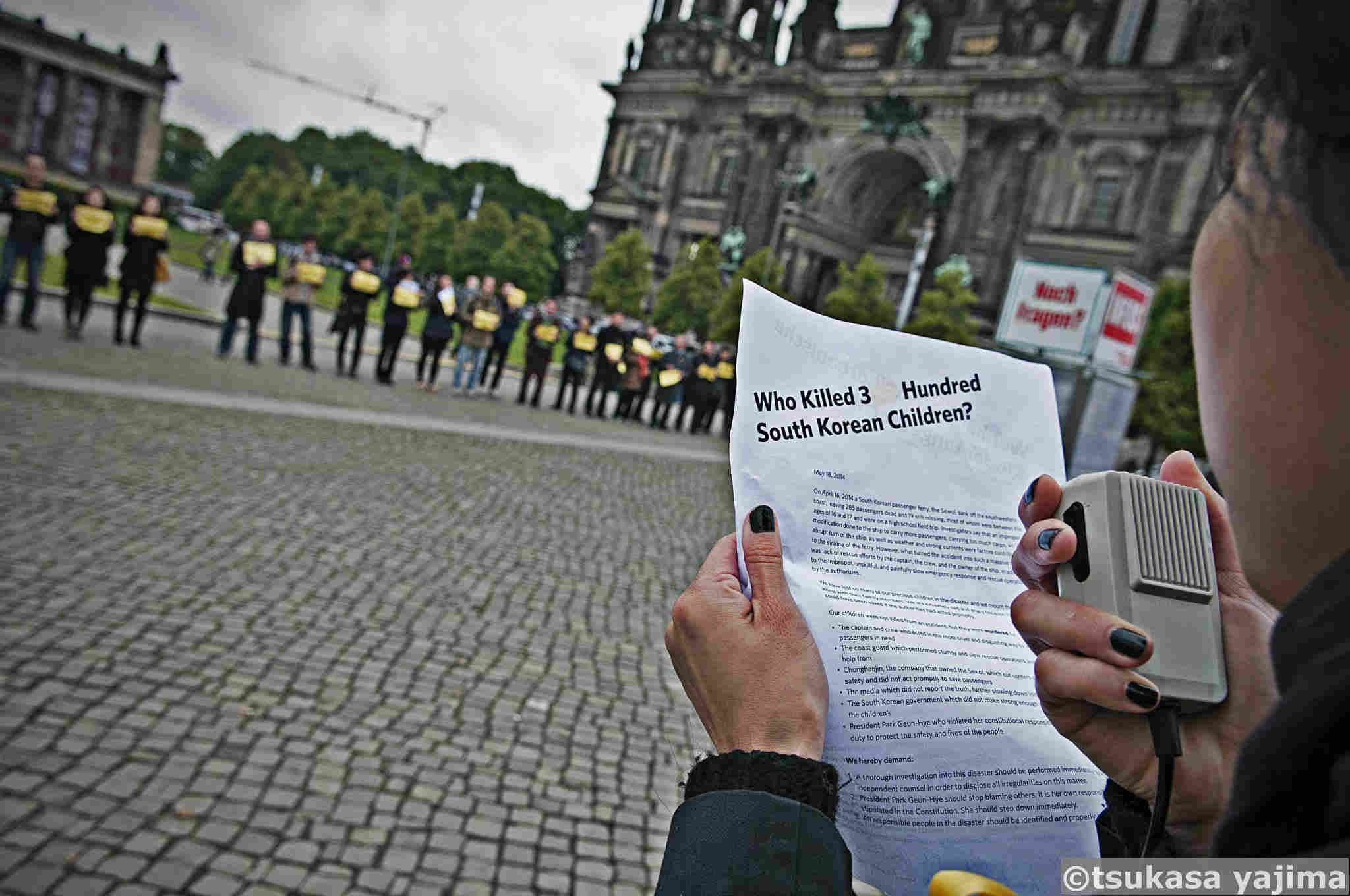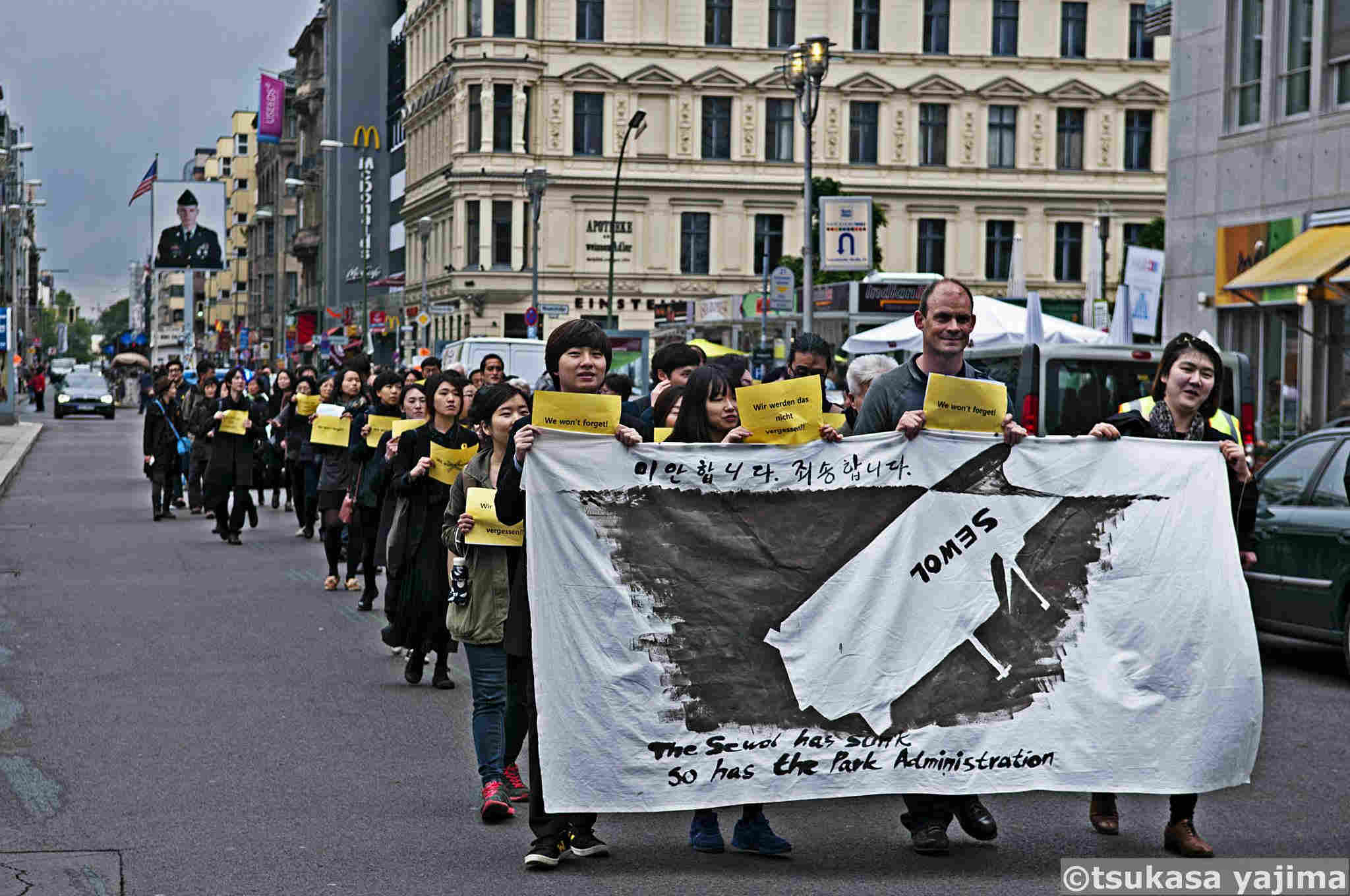 어제 독일 전국에서, 세계 모든 나라에서 베를린에 몰려든 관광객들이 베를린의 중요 관광지점에서 언론에서만 읽었던 한국인의 세월참사 분노에 대한 증인이 되었다. 시위자들이 손에 든 노랑색 종이에 영독으로 쓰여진 “잊지 않겠다”라는 구호를 보며, 전단지를 신중하게 읽으며, 영어, 프랑스어, 독어로 애도를 표하며, 시위자들이 지나간 자리에, 격려의 말을 짧게나마 던지며, 한국인들의 분노에 진지하게 고개를 끄덕이며, 시위자들이 지나간 자리에 눈길을 떼지 못했다.
